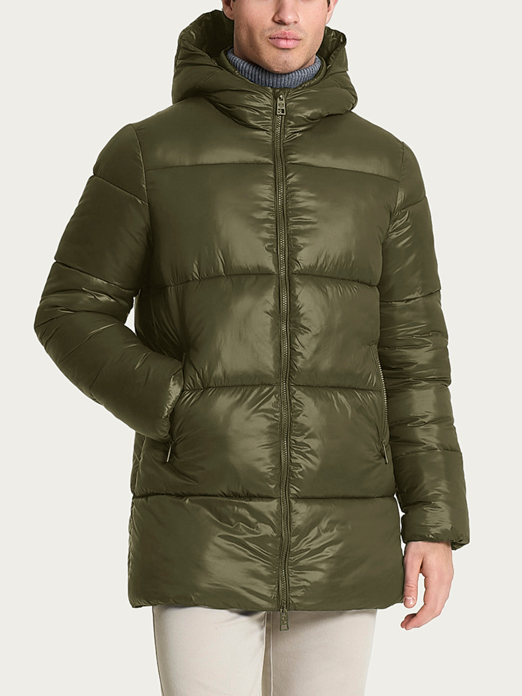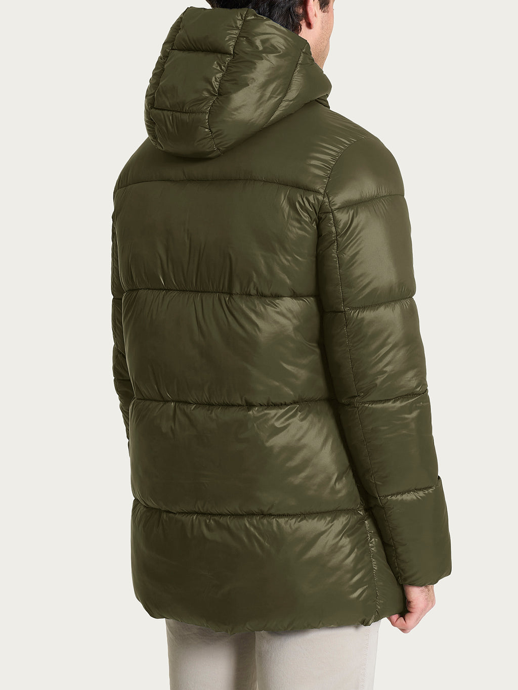 Piumino shiny con cappuccio in Vegan Down - Dark Olive