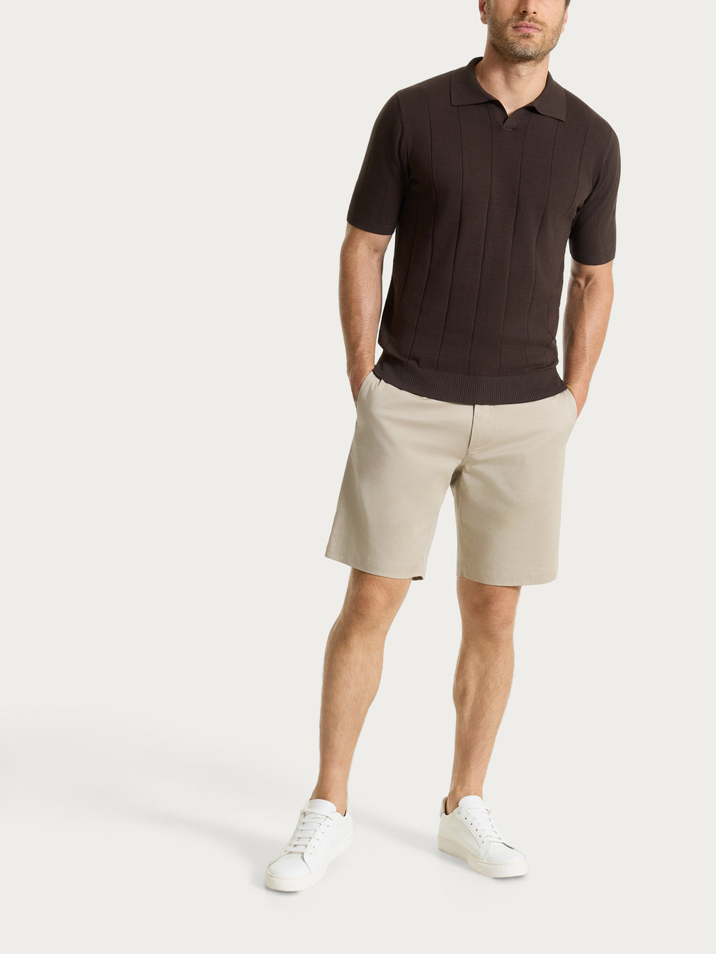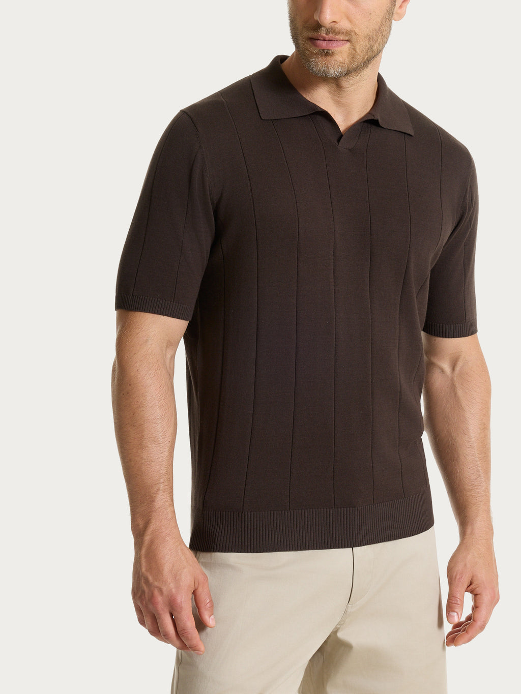 Il collo polo aperto, privo di bottoni, definisce lo scollo con un taglio moderno e più rilassato, mantenendo comunque un aspetto ordinato e versatile.