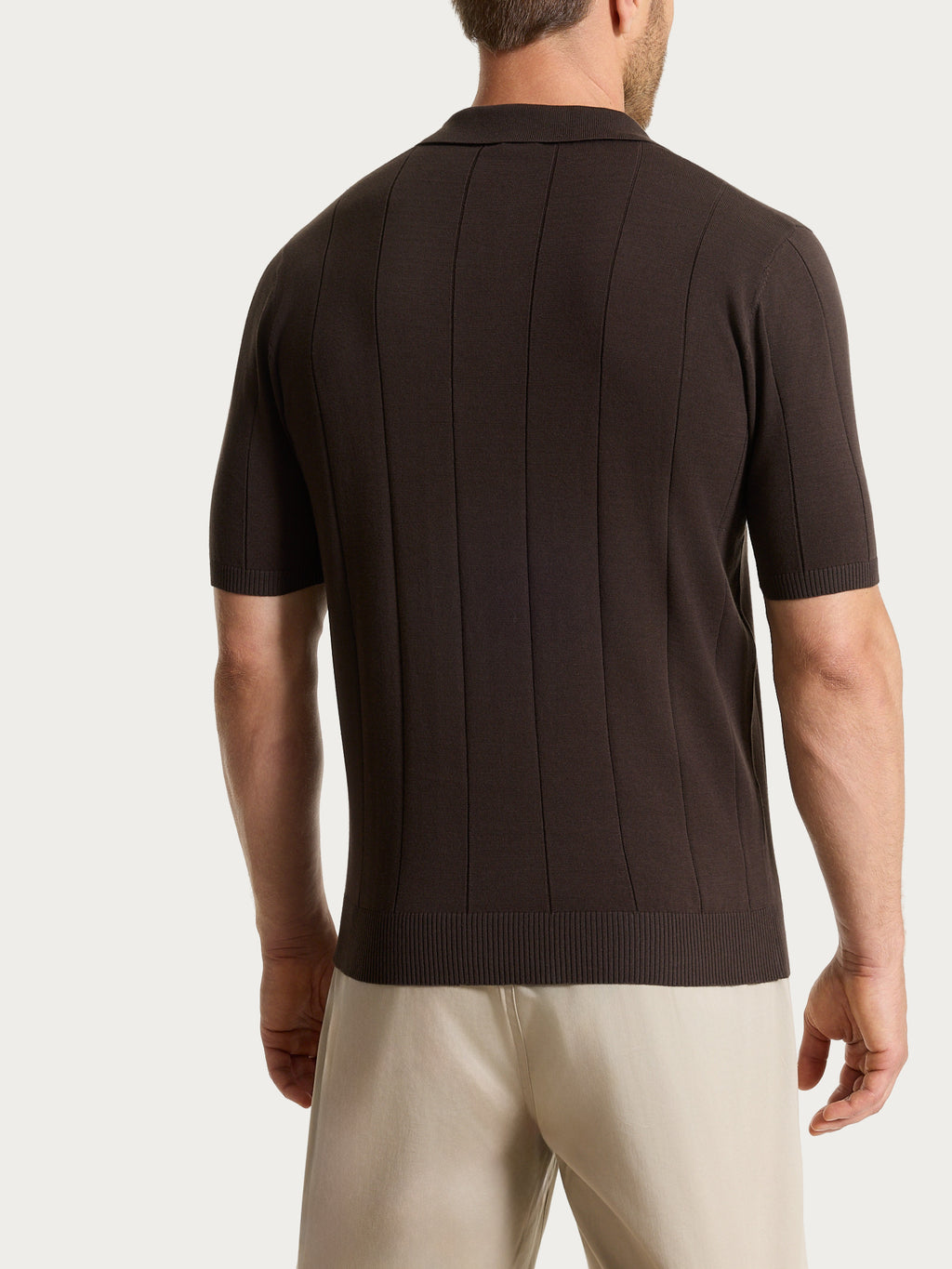 Il capo è lavorato a costa piatta, una trama ordinata e regolare che dona struttura e una resa sempre curata. La particolarità è la rigatura verticale ottenuta direttamente in maglia: il disegno nasce dall’alternanza della lavorazione, creando un effetto a rilievo uniforme e percepibile al tatto, integrato nel tessuto e stabile nel tempo.