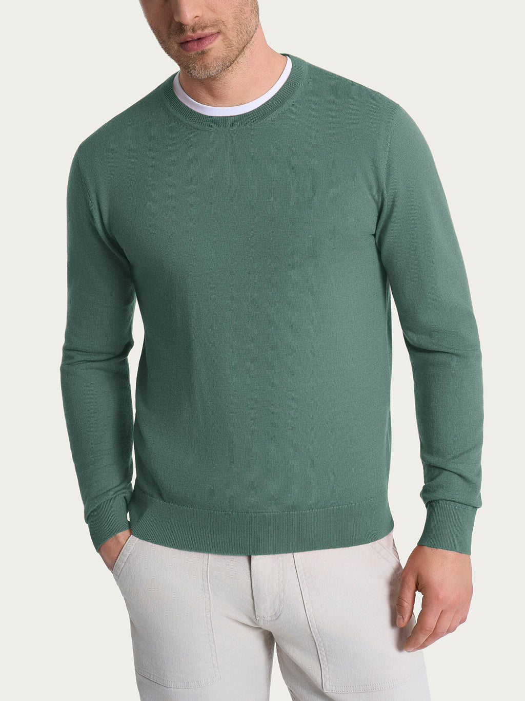 Maglia girocollo da uomo in pura lana merino, tessuto in finezza 12, estremamente morbido e caldo.