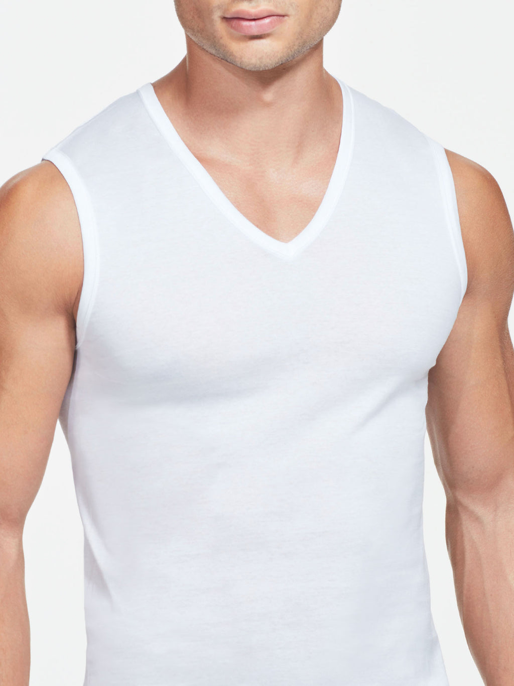 Maglietta smanicata con scollo a V in puro cotone mercerizzato.
