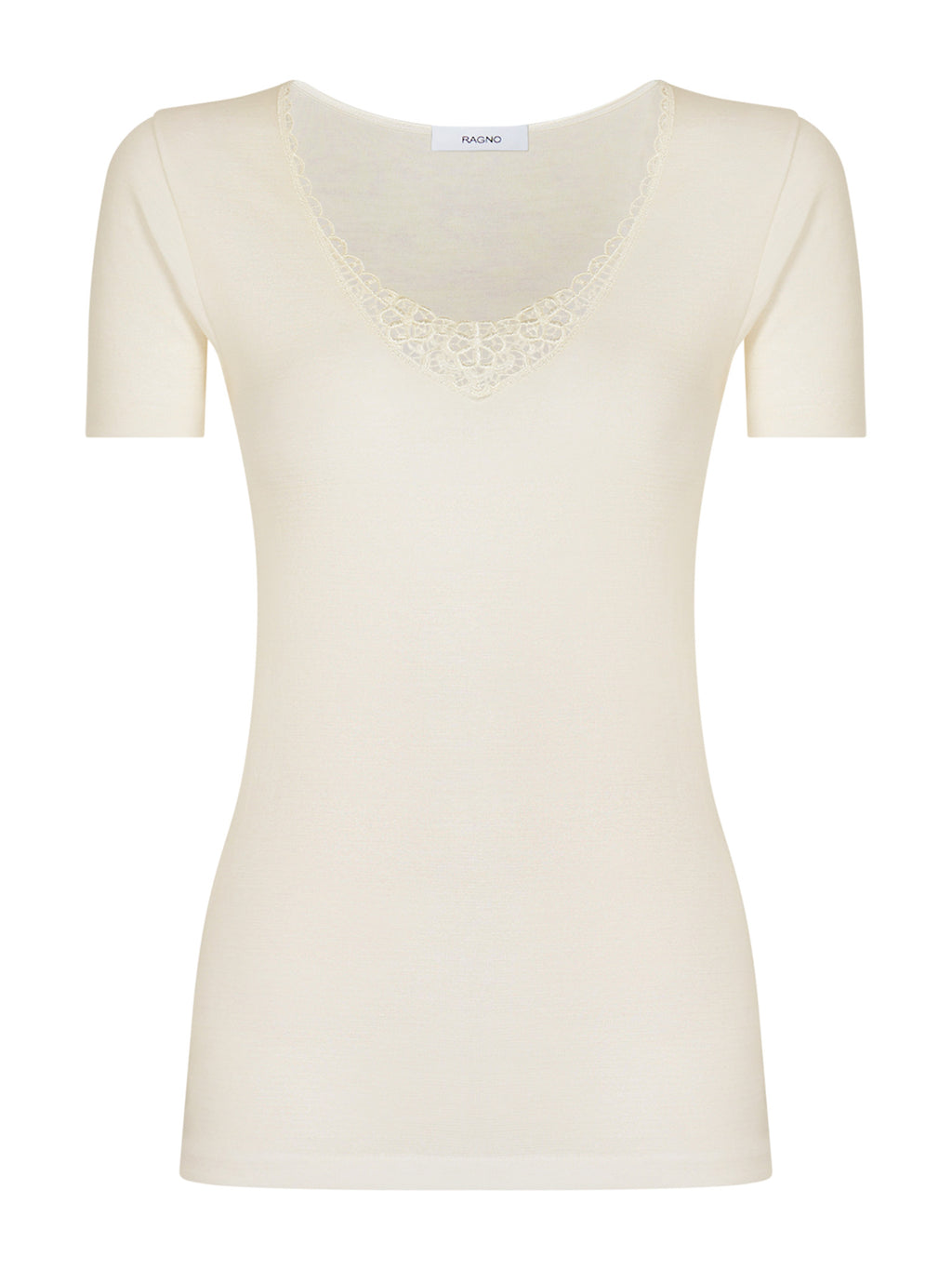 Maglietta a manica corta in tessuto doubleface realizzato in pura lana fuori e cotone sulla pelle impreziosita dal profilo della scollatura in pizzo.