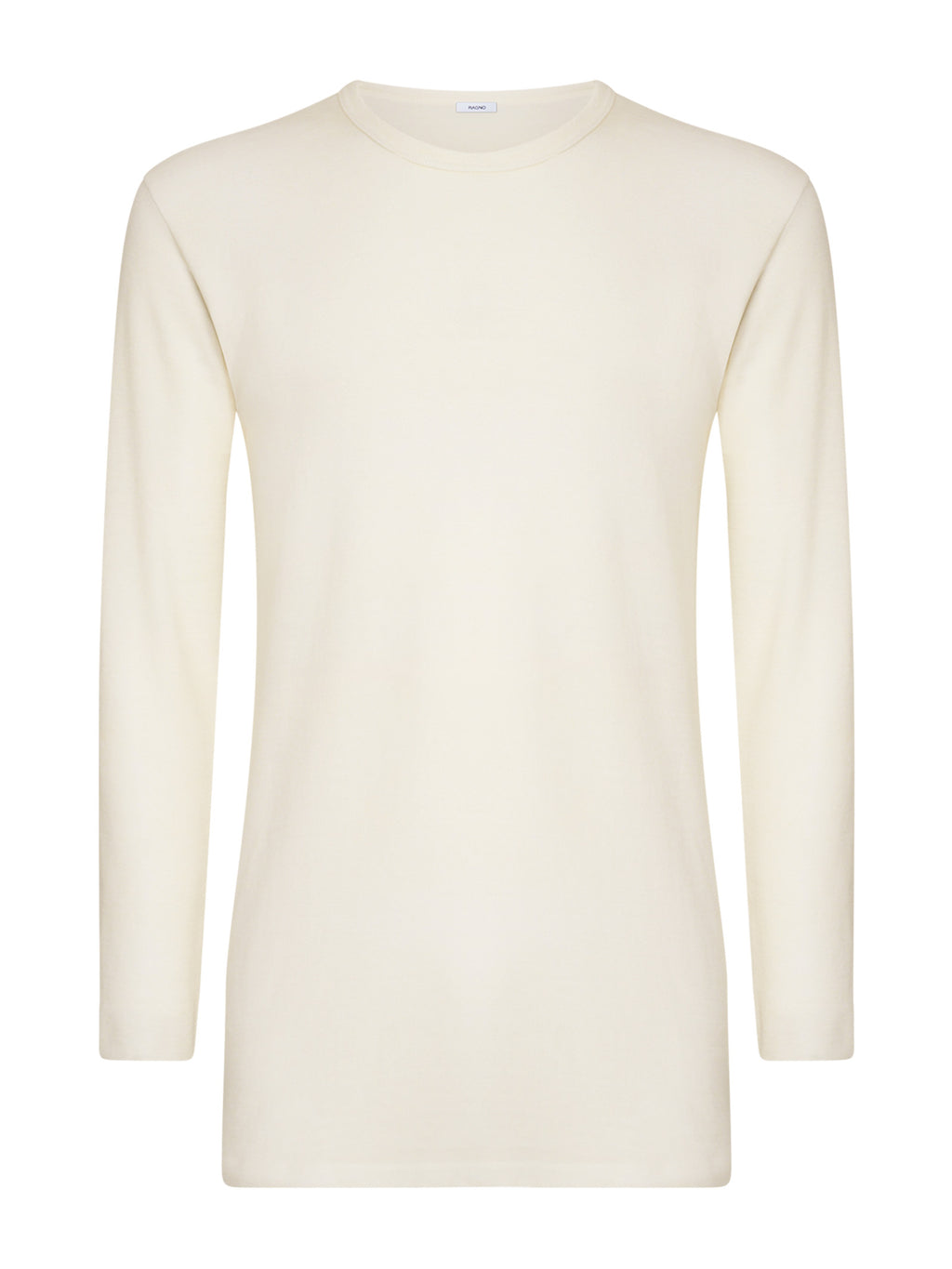 Maglietta girocollo a manica lunga in lana rinforzata fuori e cotone sulla pelle.