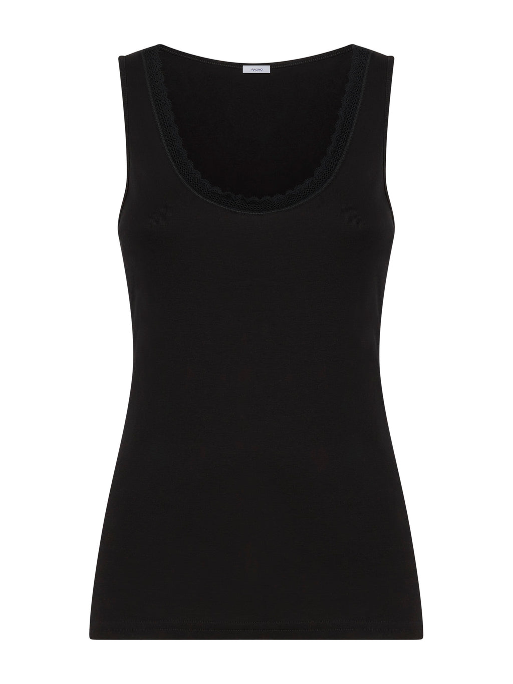 Il suo design elegante è impreziosito da un bordino in pizzo delicatamente applicato lungo lo scollo, conferendo un tocco di raffinatezza e femminilità al capo.