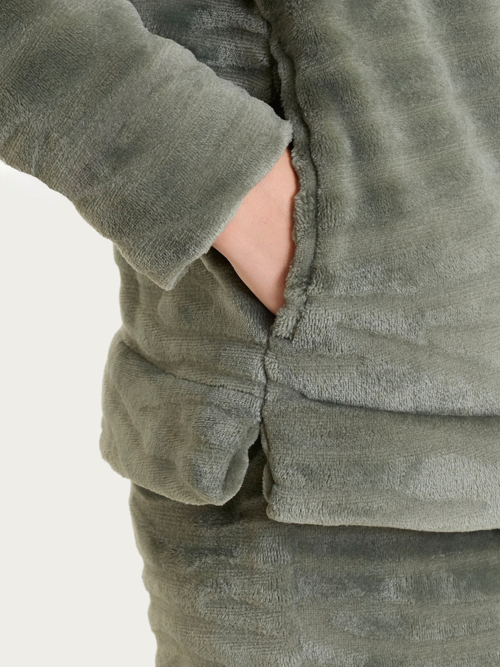 Realizzato in Coral Fleece, tessuto in microfibra noto per la sua straordinaria morbidezza e l’effetto vellutato al tatto. E' più soffice e fitto rispetto al pile tradizionale, si distingue per la sua texture compatta e calda, che trattiene efficacemente il calore corporeo offrendo una sensazione avvolgente e confortevole sulla pelle.