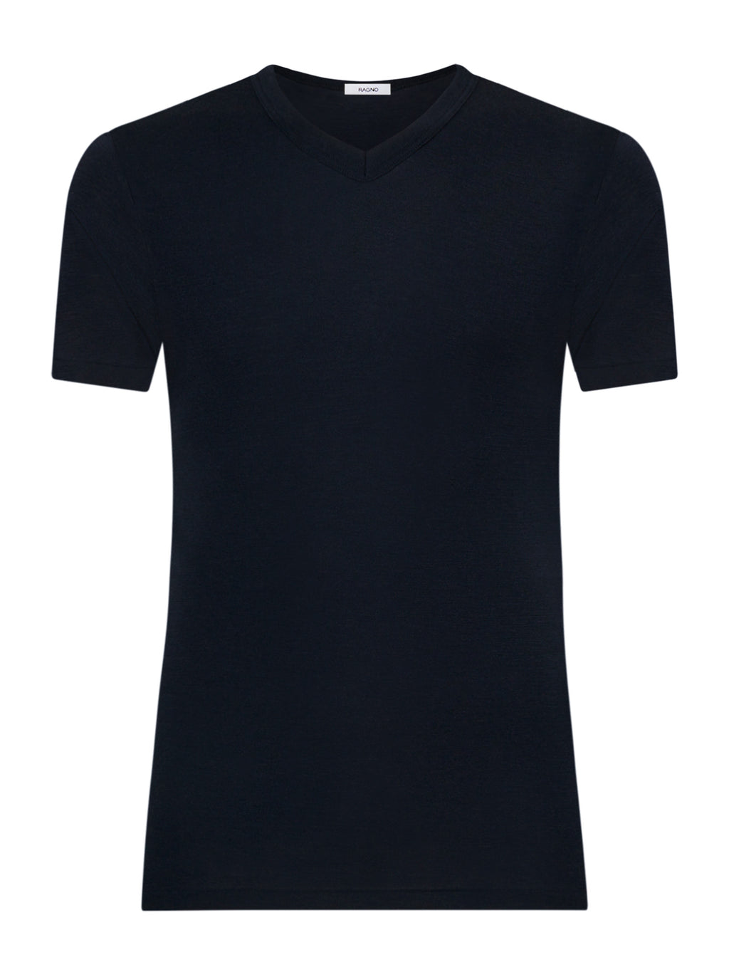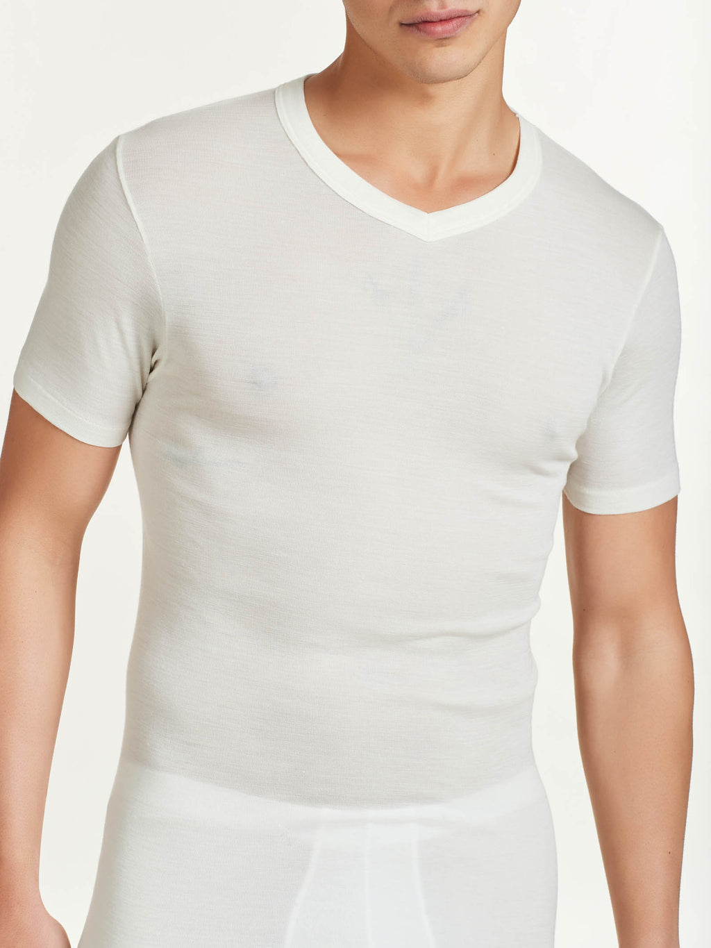Maglietta scollo a V a manica corta in preziosa maglia unita di lana e seta.