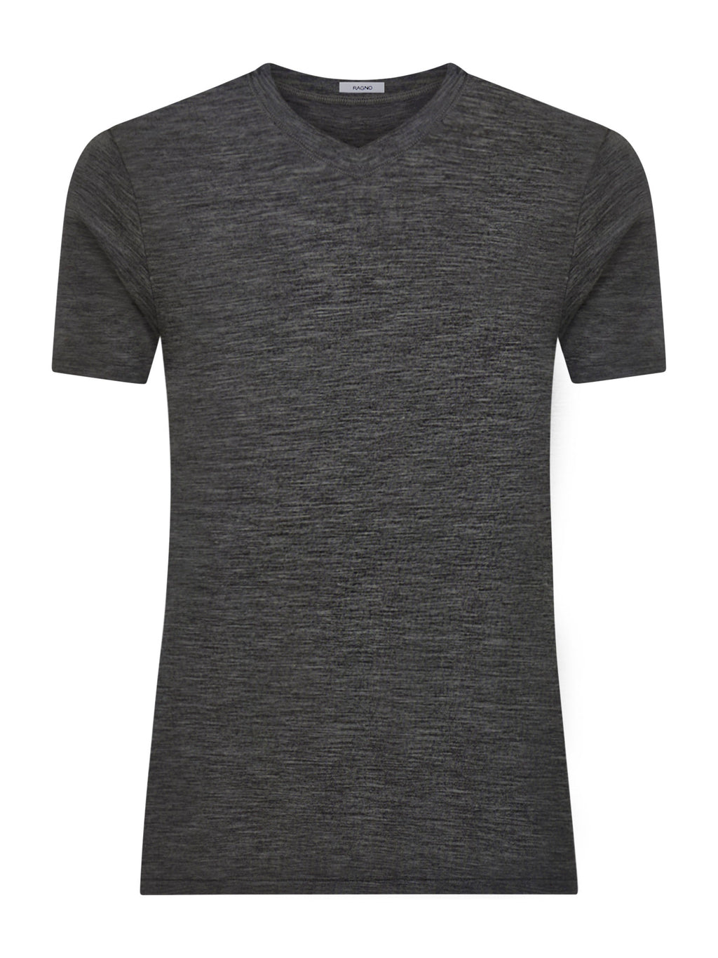 Maglietta scollo a V a manica corta in preziosa maglia unita di lana e seta.